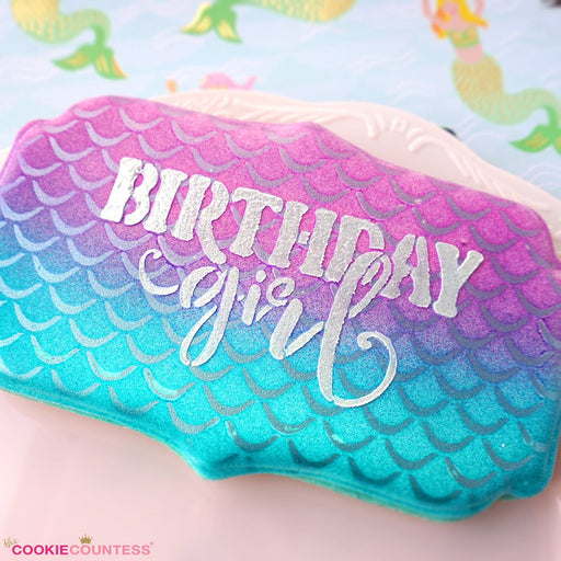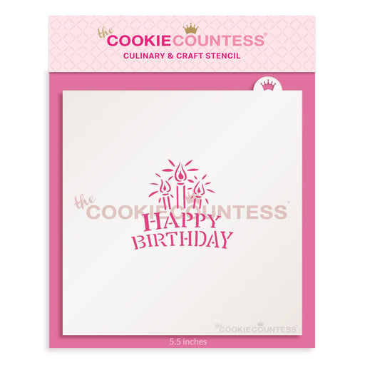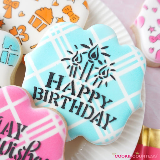 Stencil with "Happy Birthday" four ways. Overall size approximately 5.5" x 5.5". For easiest application, use with the Cookie Countess Stencil Ada...