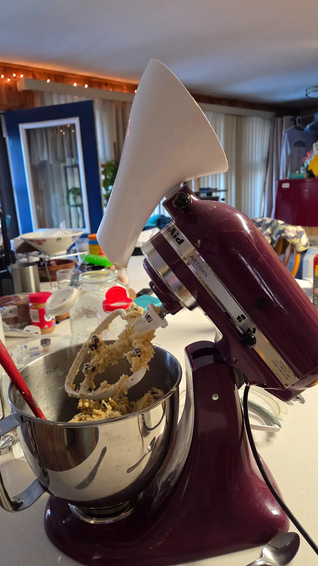 The Countess Flour Funnel attaches firmly to a stand mixer's auxiliary port, and it is angled just right to easily add your flour (or any dry or liquid ingredients) to your bowl. You can also still lift or tilt the mixer head with the Countess Flour Funnel still attached. AND you can run your mixer while it is attached as well. Win Win Win!