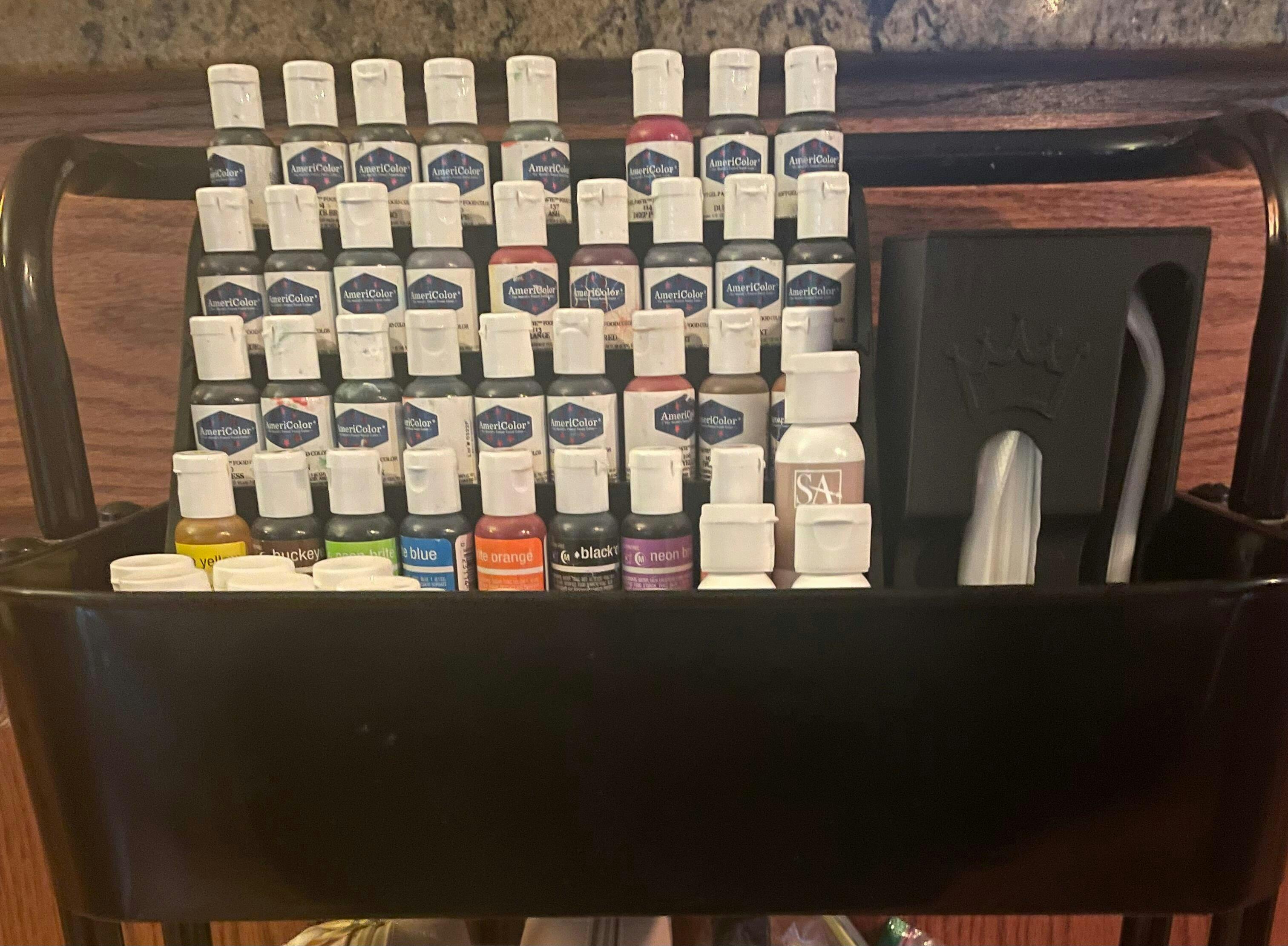 • The Mini Bottle Bar holds up to 45 0.75 oz Cookie Countess gel or airbrush bottles (or similar sized bottles). Also holds small dust pump bottle.