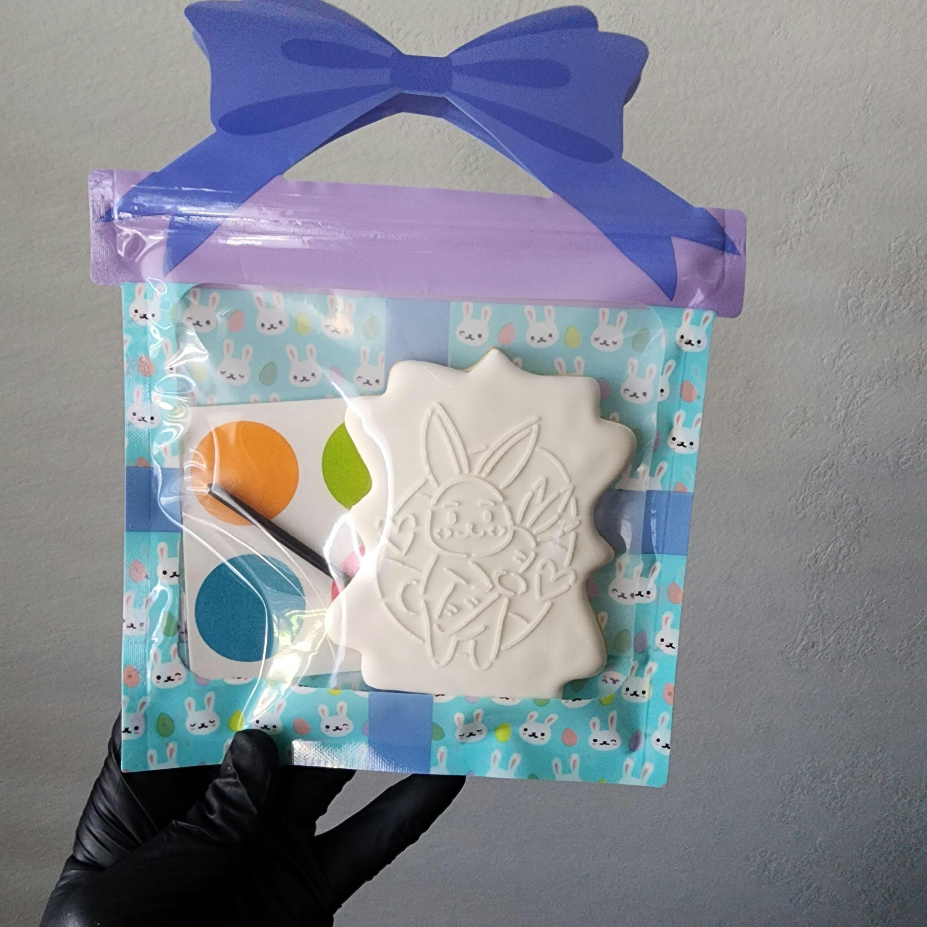 Palettes should be not be packed in direct contact with cookies, due to the possibility that moisture from the cookies can activate the paint on the palettes and cause smudging. It is preferable to bag the palette/brush separately and then insert that bag behind the cookie.