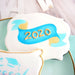 The 2020 cookie shown uses the following airbrush colors: Beachy Blue, Ultra Blue, 14 Karat Gold. Piping is done with white royal icing and hand colored with Edible Art Paint in Pure Gold.