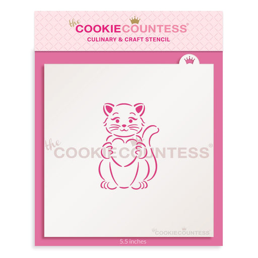 Cat with Heart stencil. Design size is approximately 2 x 2.9" Overall stencil size is 5.5" x 5.5". PINK sections in image are the open sections. St...