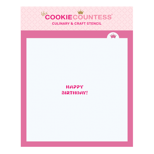 Stencil with "Happy Birthday" four ways. Overall size approximately 5.5" x 5.5". For easiest application, use with the Cookie Countess Stencil Ada...