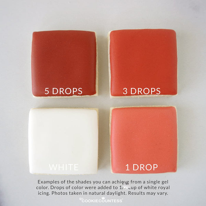 Cookie Countess Gel Colors are highly concentrated and provide vibrant color with less liquid. Have fun experimenting by using a pinch of these colors to create softer hues.