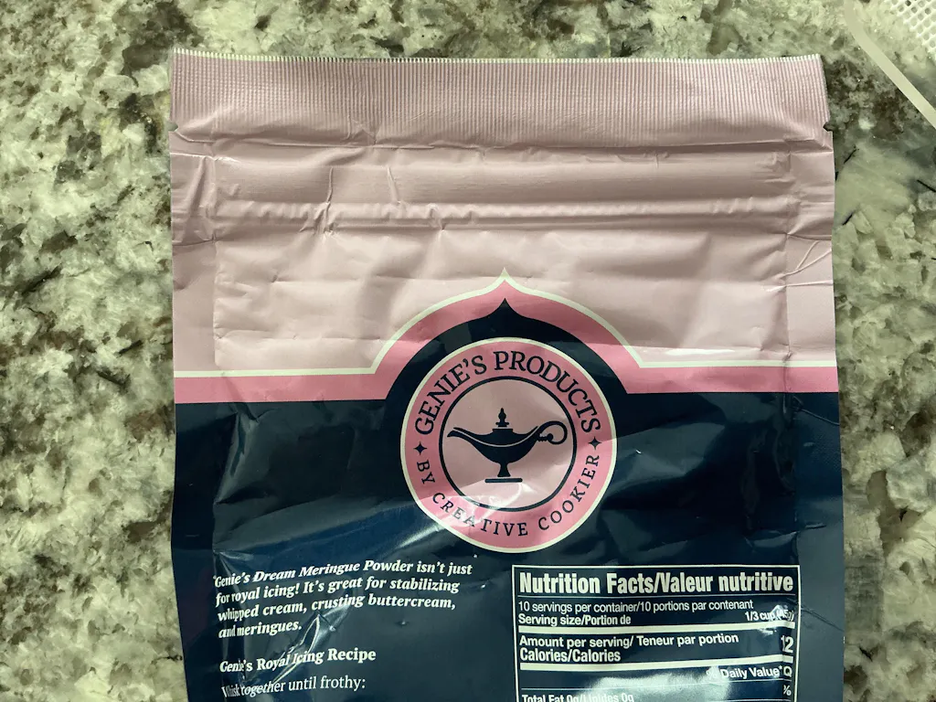 Genie's Dream Meringue Powder 1lb. This is a meringue powder like no other. Made of the best quality ingredients, it will give your royal icing a taste and sheen like never before. It has a wonderful smell and dries beautifully.