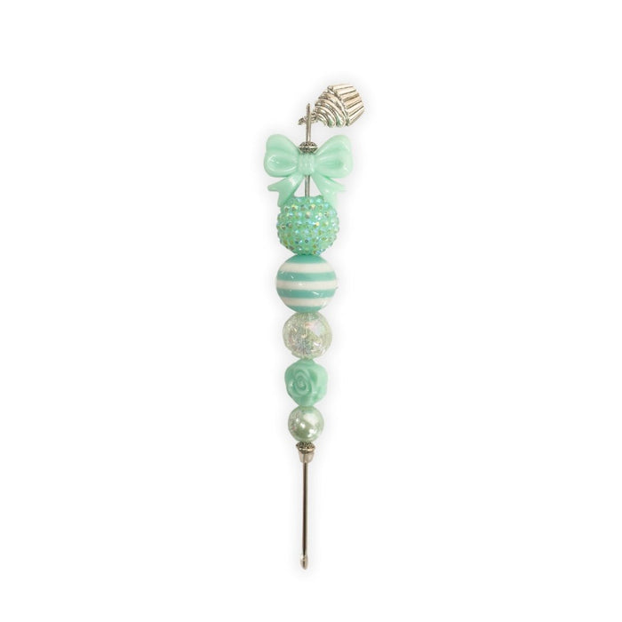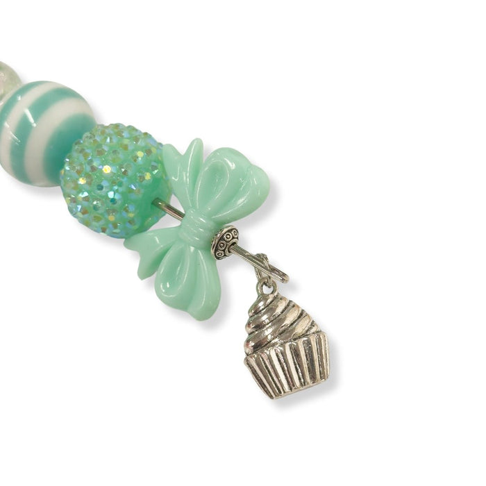 This scribe is features assorted beads, a bow and a silver cupcake charm at the top.